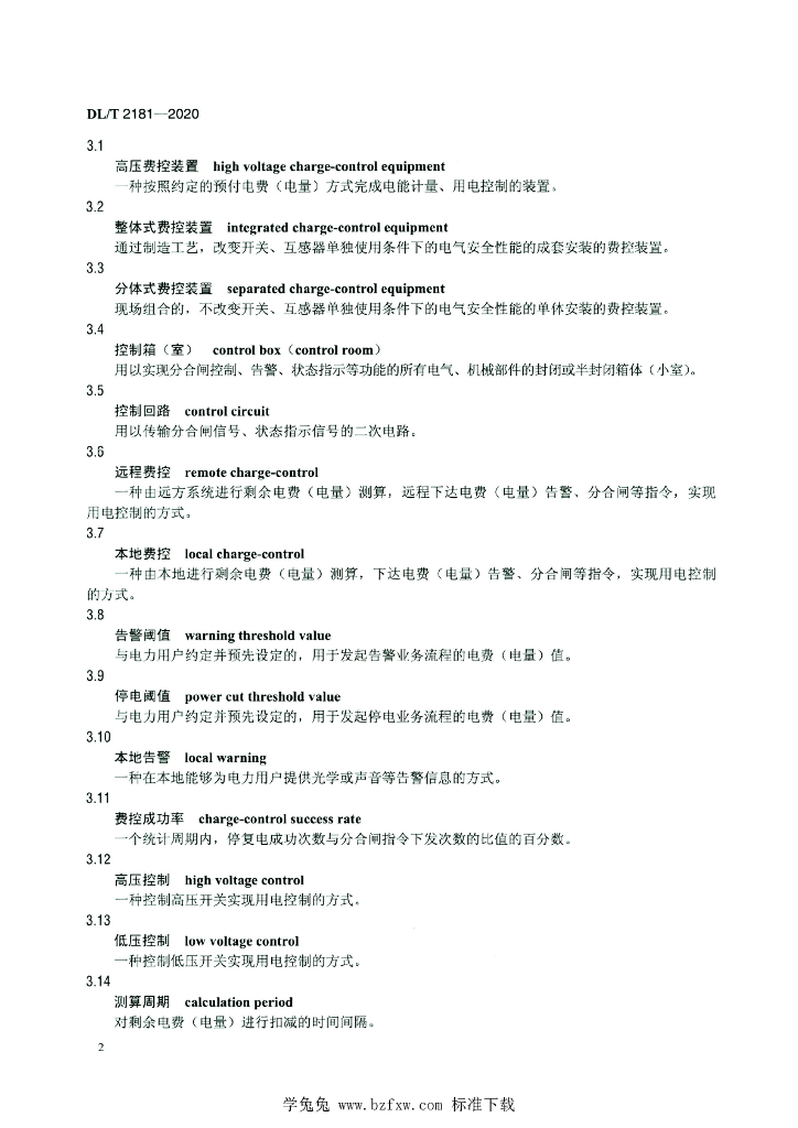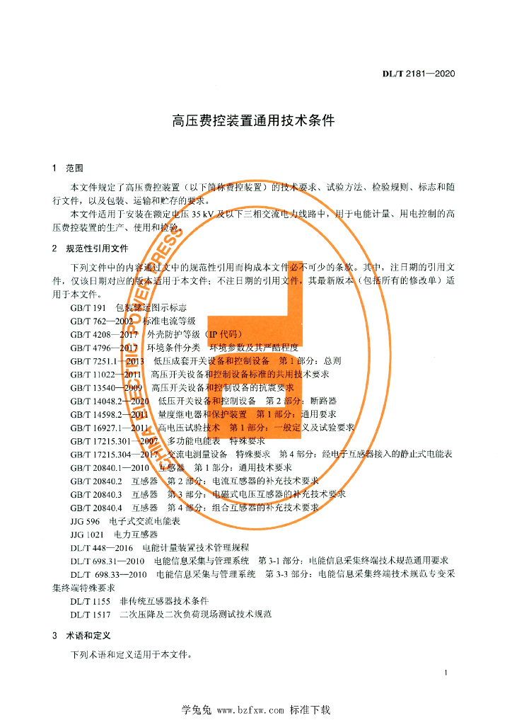 DL/T 2181-2020 高压费控装置通用技术条件