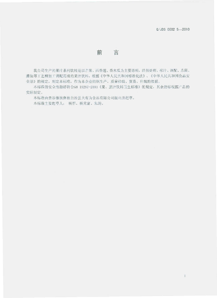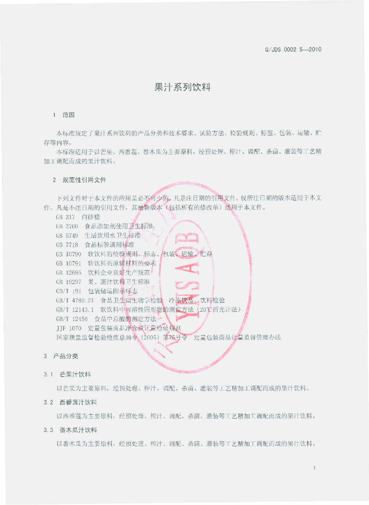 Q/JDS 0002S-2010 果汁系列饮料