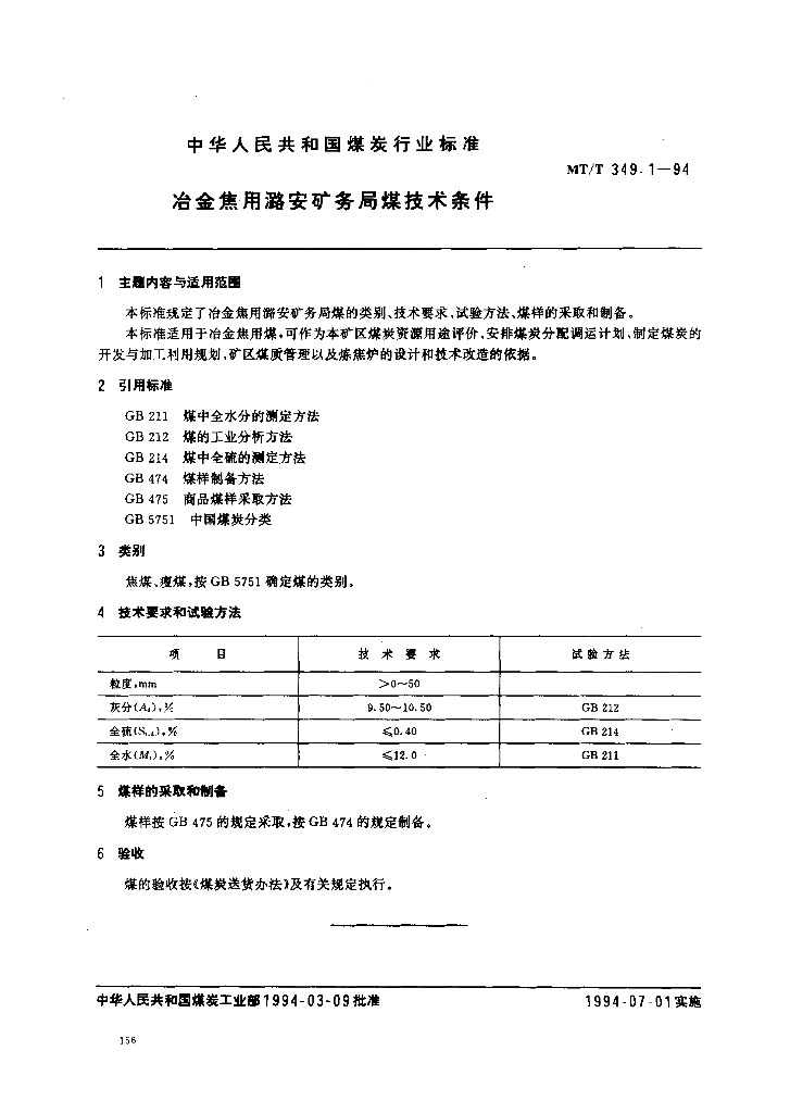 MT/T 349.1-1994 冶金焦用潞安矿务局煤技术条件