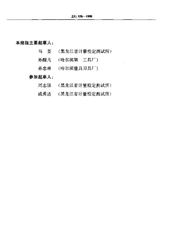 马荃(黑龙江省计量检定测试所)、孙醒凡(哈尔滨第一工具厂)、孙忠林(哈尔滨量具刃具厂)、周志强(黑龙江省计量检定测试所)、戚勇达(黑龙江省计量检定测试所)