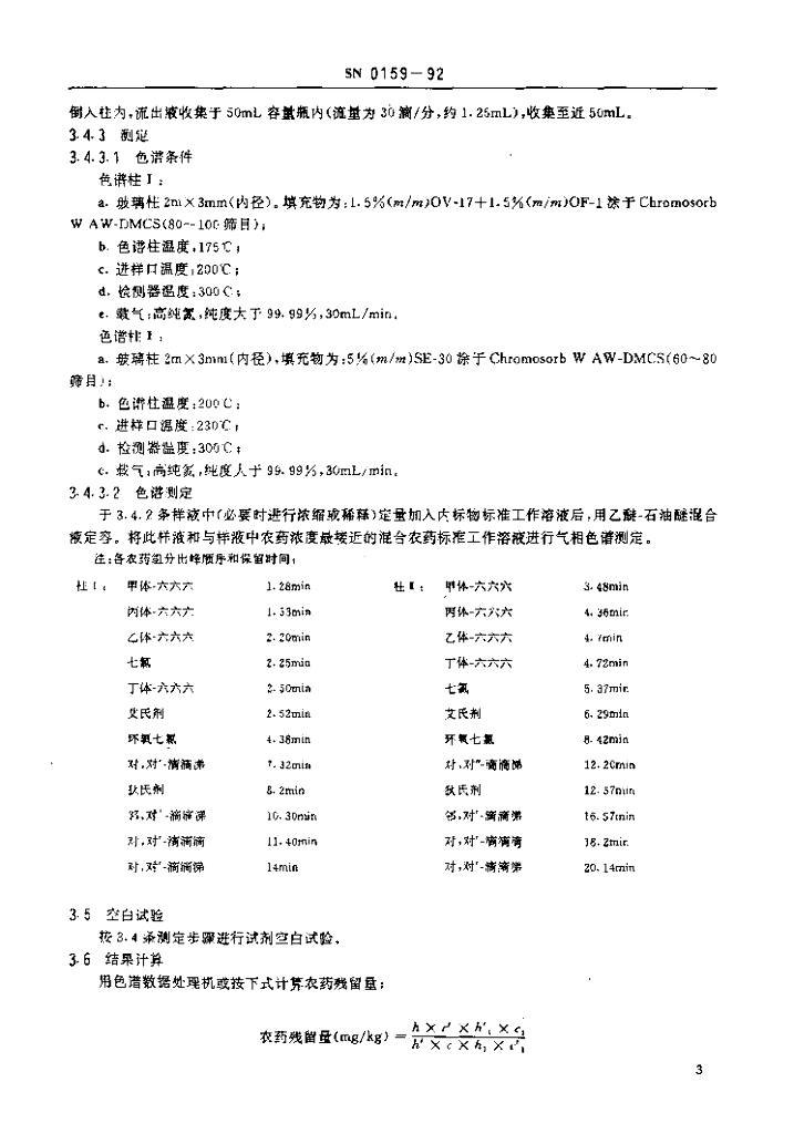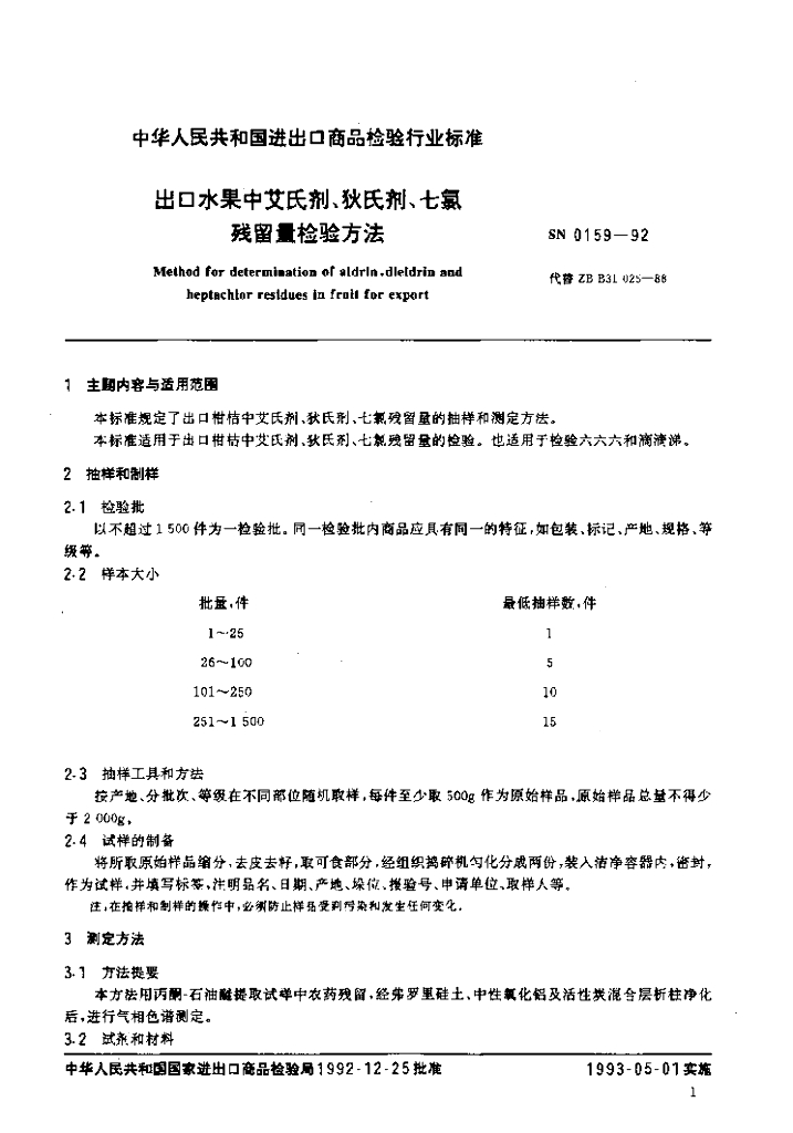 SN 0159-1992 出口水果中艾氏剂、狄氏剂、七氯残留量检验方法