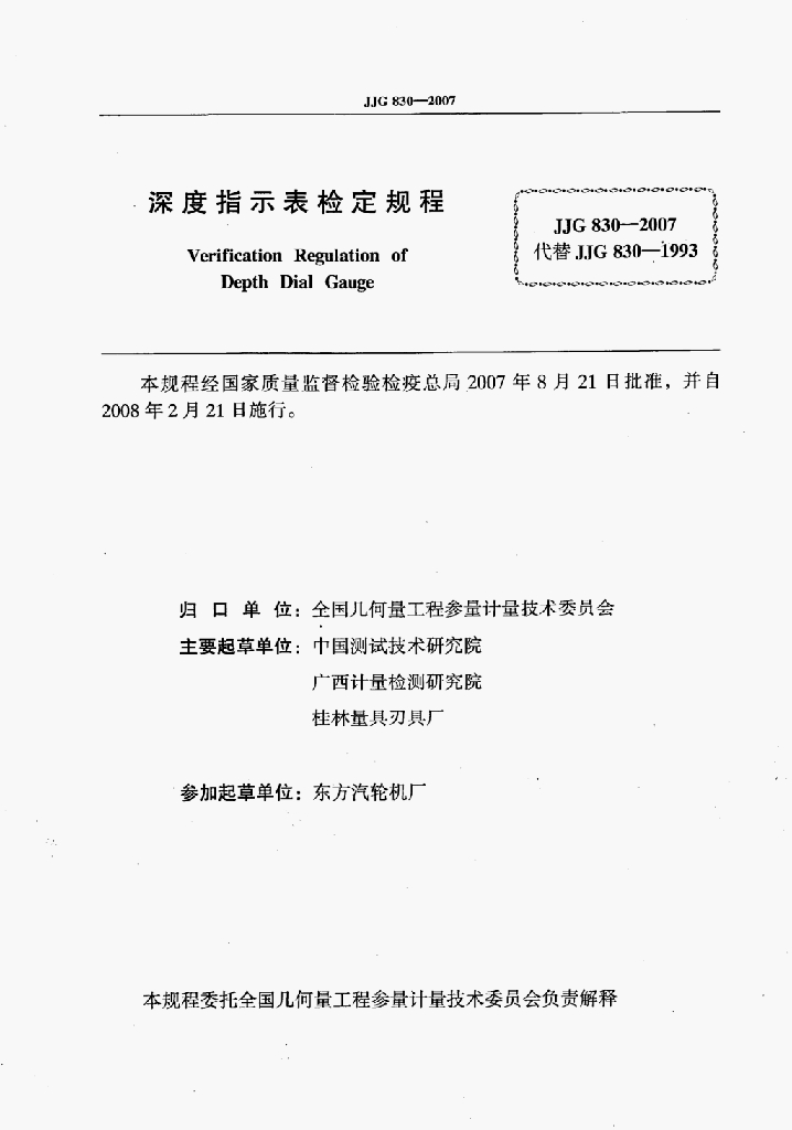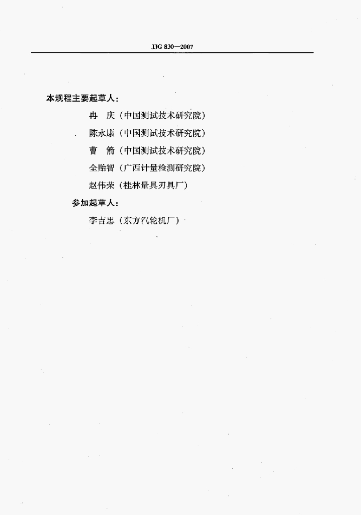 冉庆(中国测试技术研究院)、陈永康(中国测试技术研究院)、曹箭(中国测试技术研究院)、全贻智(广西计量检测研究院)、赵伟荣(桂林量具刃具厂)、李吉忠(东方汽轮机厂)