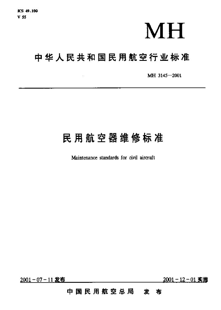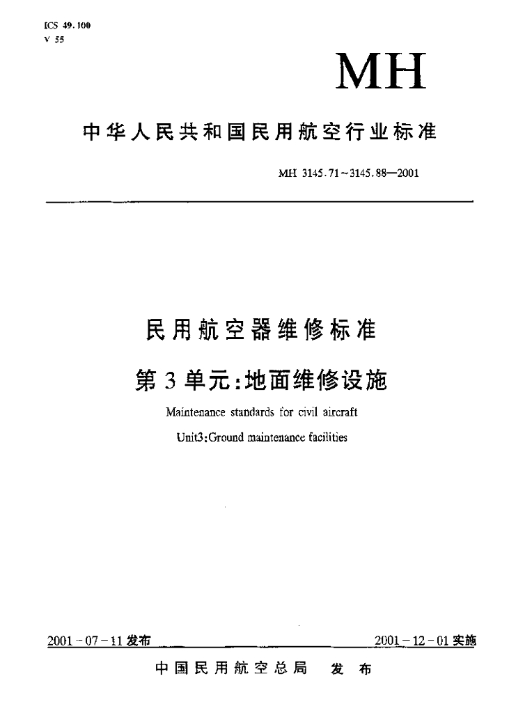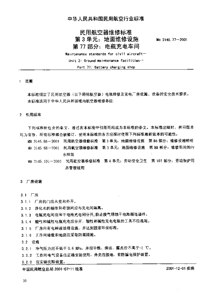 MH 3145.77-2001 民用航空器维修标准 第3单元 地面维修设施 第77部分 电瓶充电车间