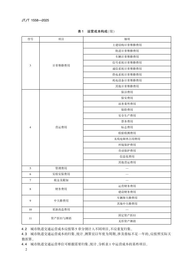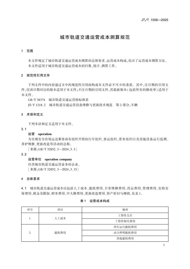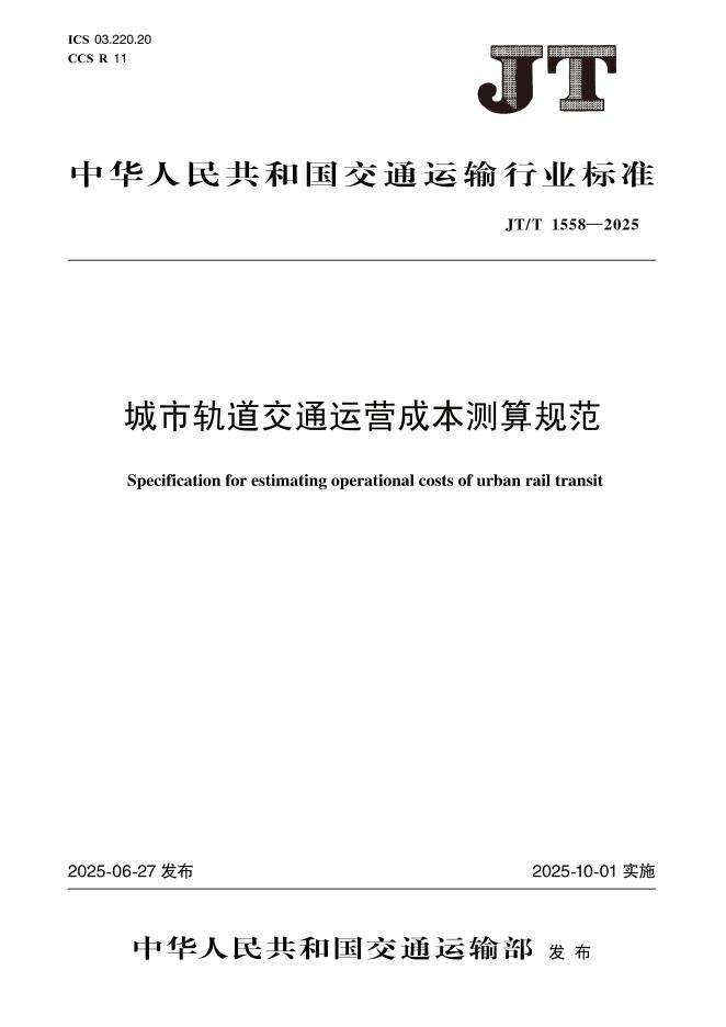 JT/T 1558-2025 城市轨道交通运营成本测算规范