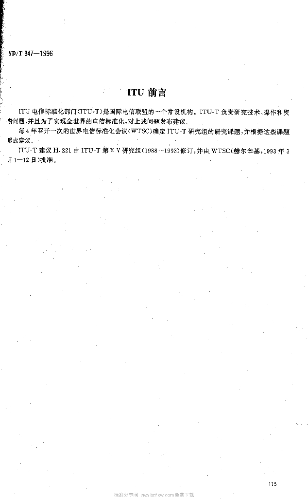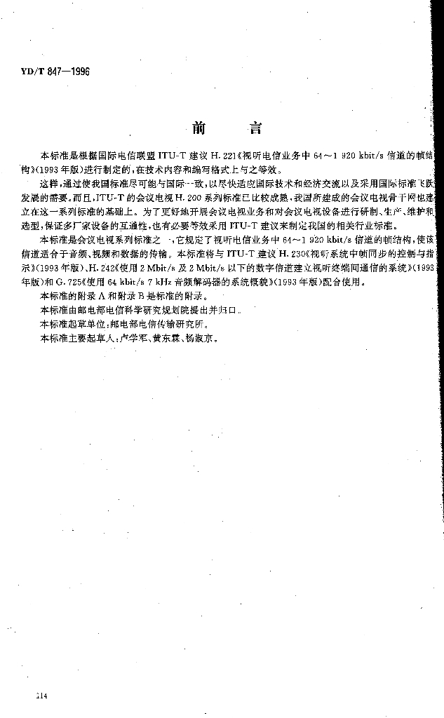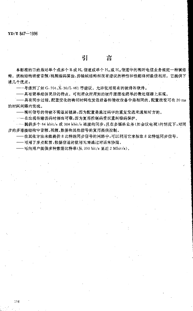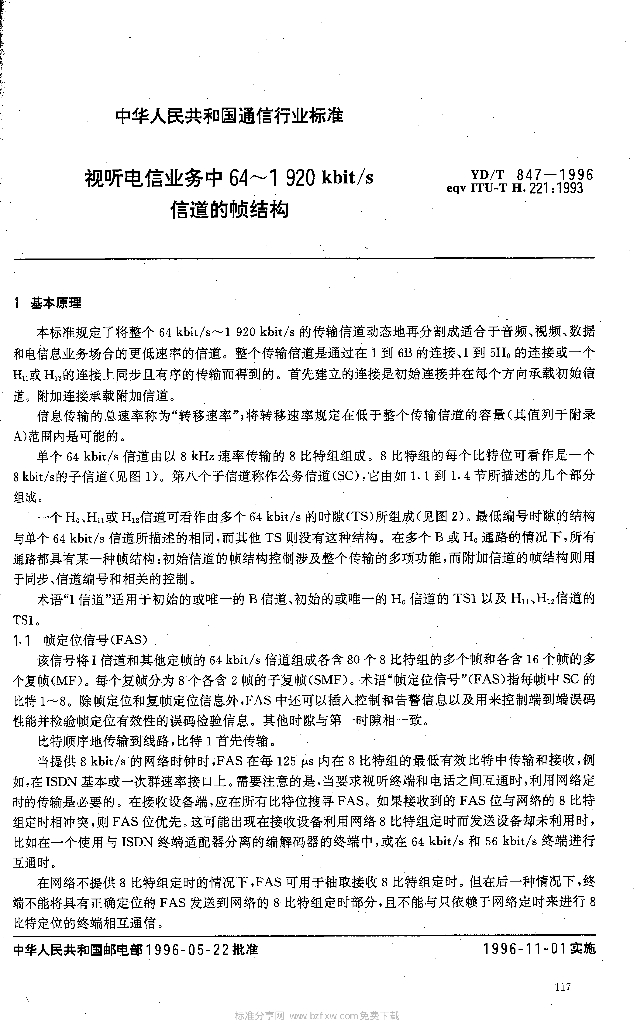 YD/T 847-1996 视听电信业务中 64~1920kbit/s 信道的帧结构