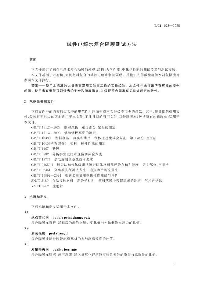 T/CI 1078-2025 碱性电解水复合隔膜测试方法