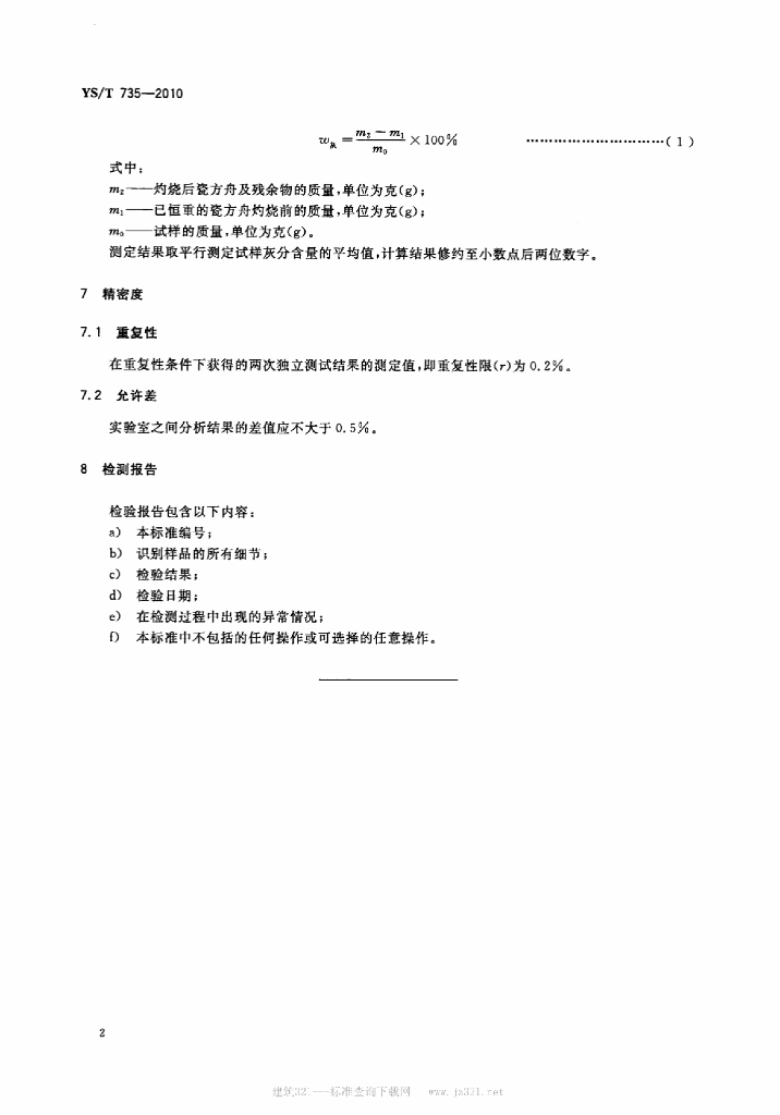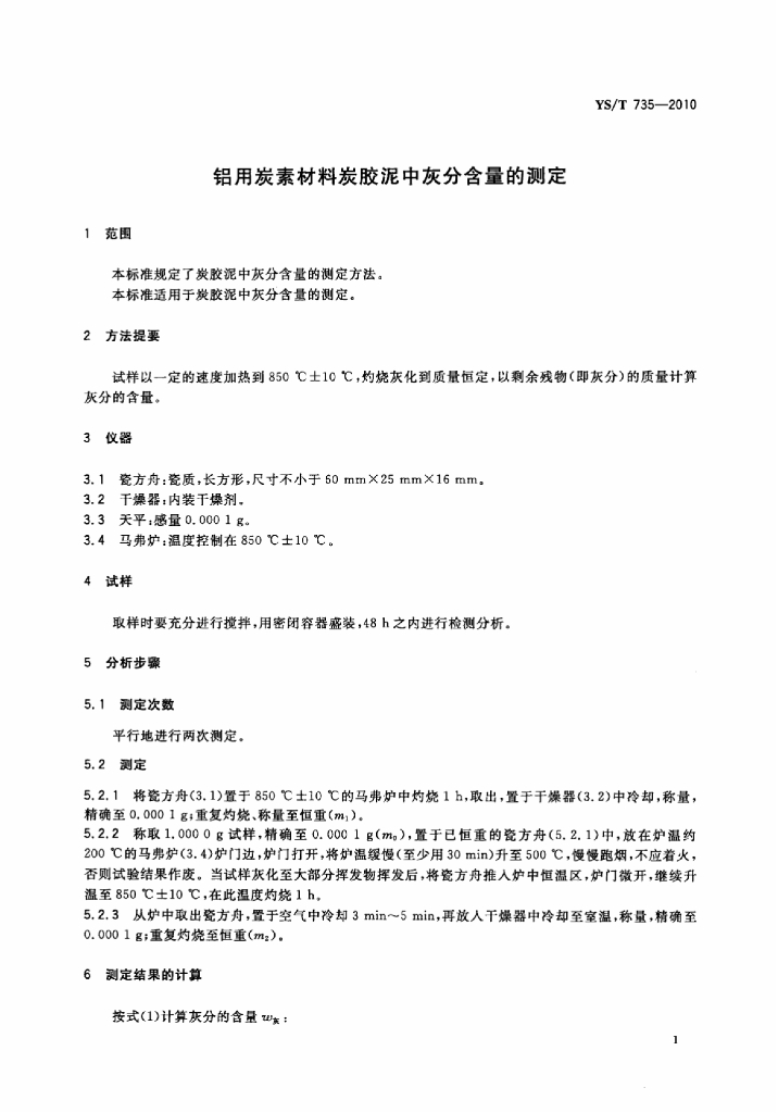 YS/T 735-2010 铝用炭素材料炭胶泥中灰分含量的测定