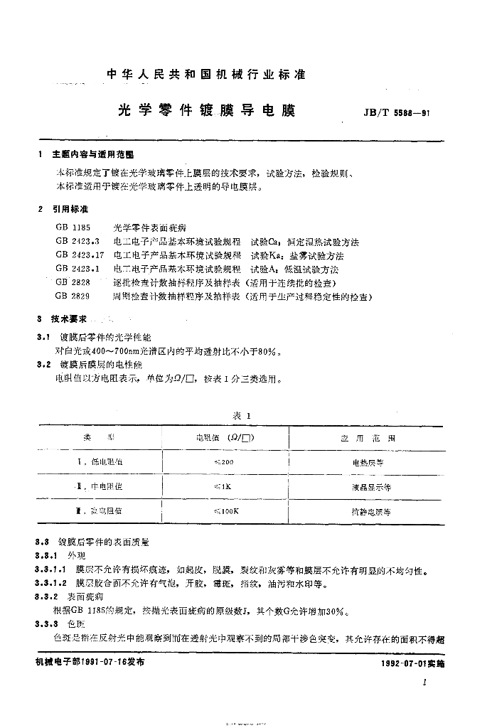 JB/T 5588-1991 光学零件镀膜 导电膜
