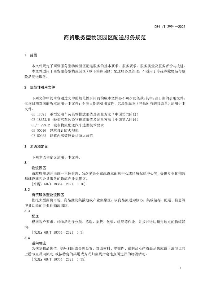 DB41/T 2994-2025 商贸服务型物流园区配送服务规范