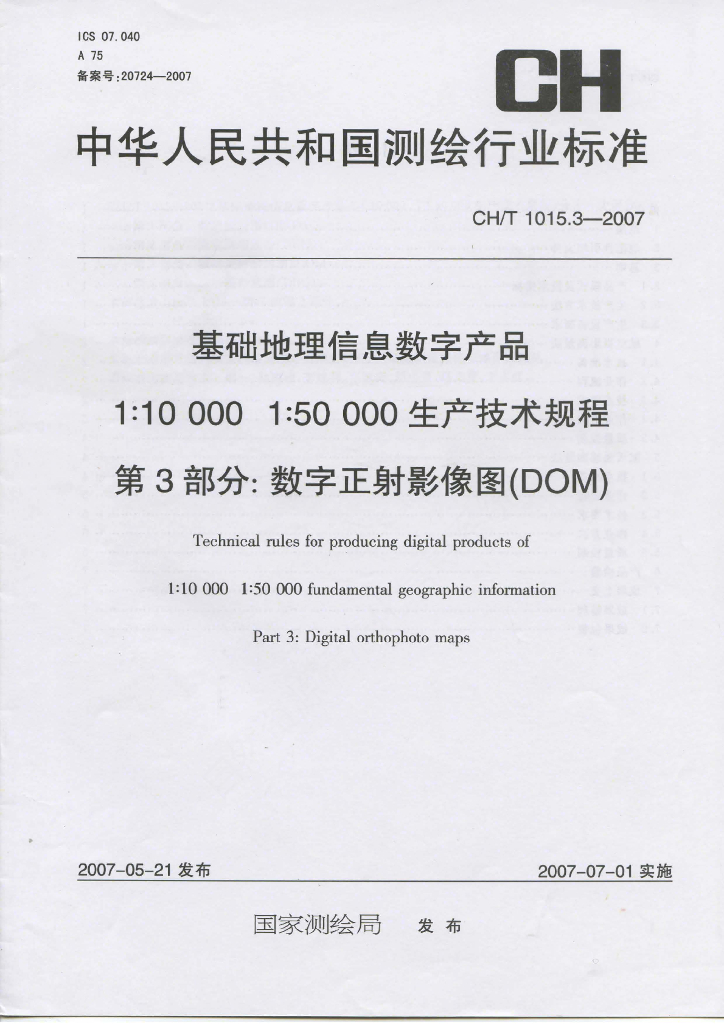 CH/T 1015.3-2007 基础地理信息数字产品1:10 000 1:50 000生产技术规程 第3部分:数字正射影像图(DOM)