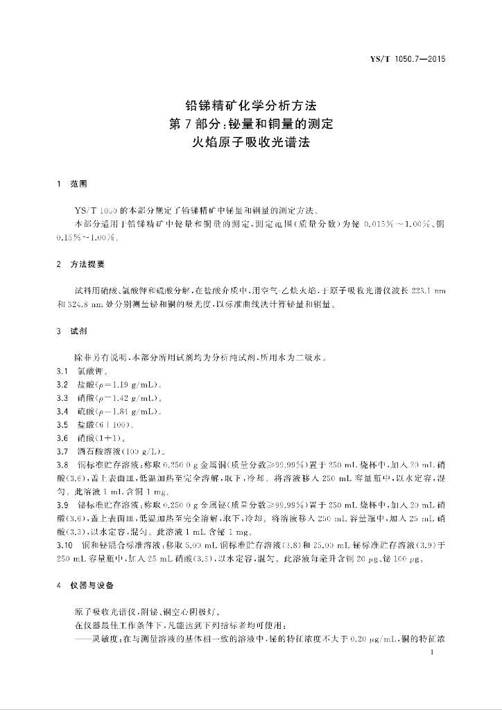 YS/T 1050.7-2015 铅锑精矿化学分析方法 第7部分:铋量和铜量的测定 火焰原子吸收光谱法