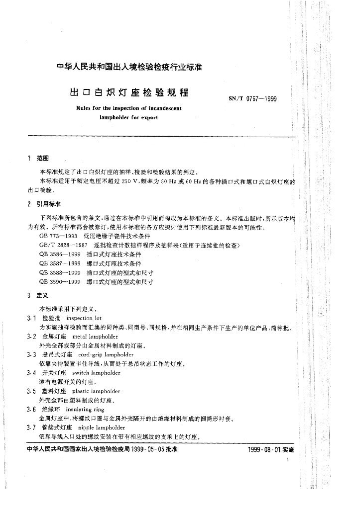 SN/T 0767-1999 出口白炽灯座检验规程