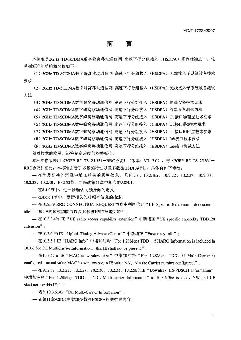 YD/T 1723-2007 2GHz TD-SCDMA数字蜂窝移动通信网高速下行分组接入(HSDPA)Uu接口RRC层技术要求