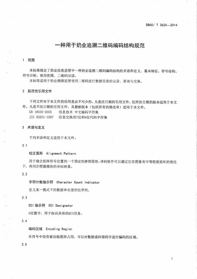 DB65/T 3624-2014 一种用于奶业追溯二维码编码结构规范