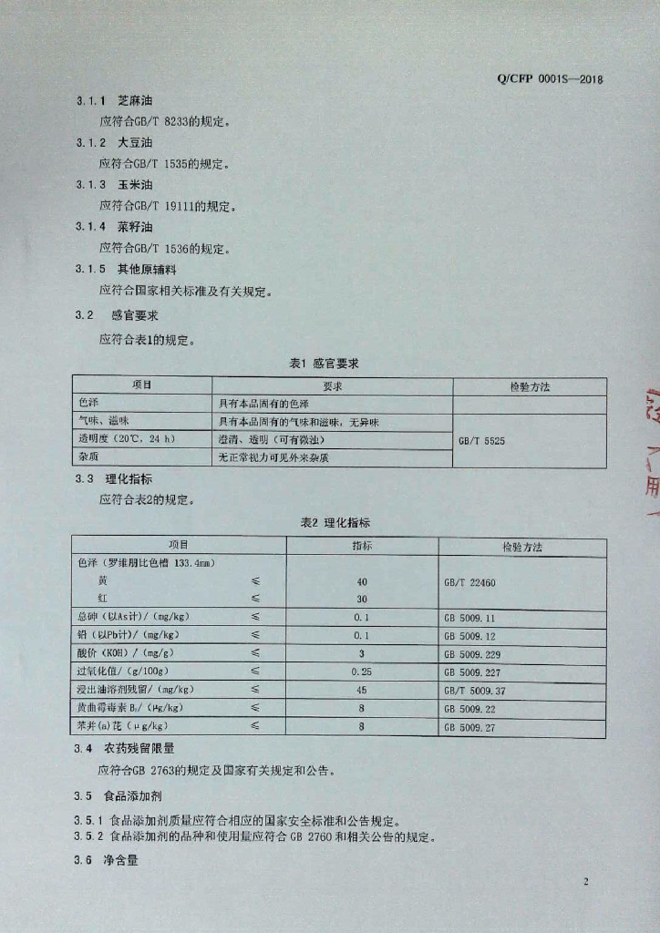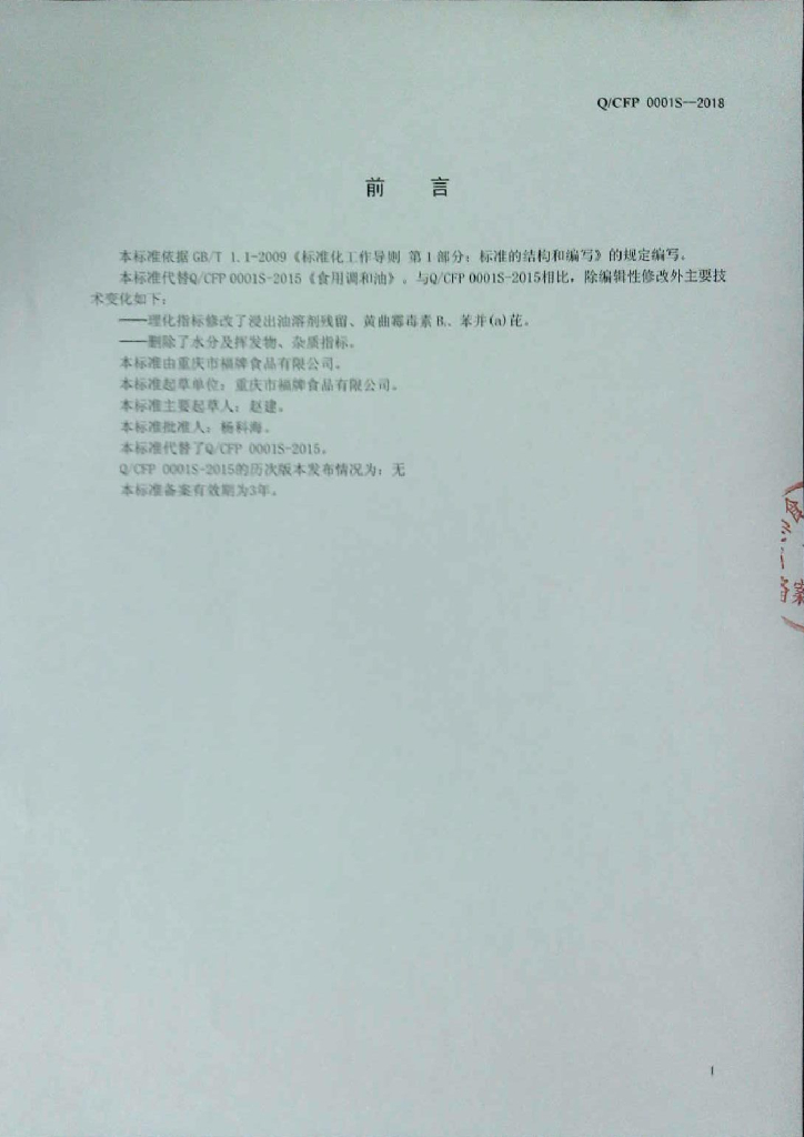 Q/CFP 0001S-2018 食用调和油