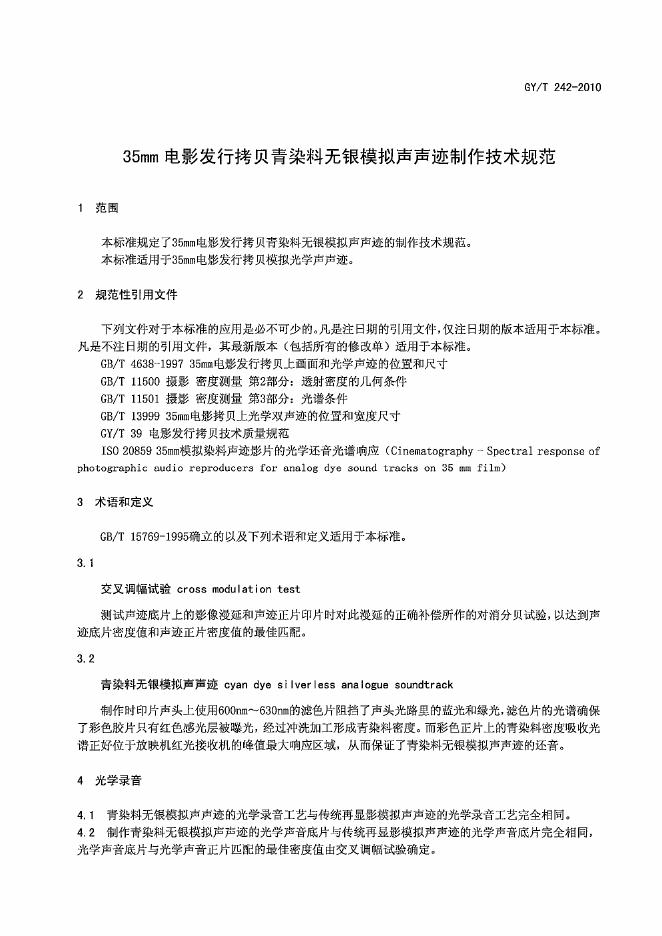 GY/T 242-2010 35mm电影发行拷贝青染料无银模拟声声迹制作技术规范