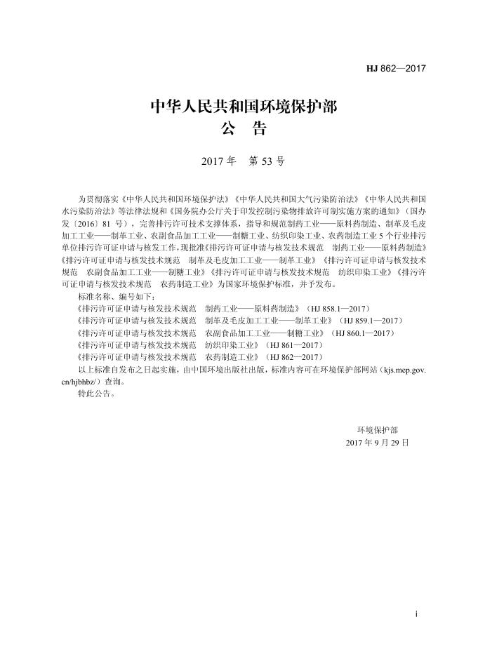 HJ 862-2017 排污许可证申请与核发技术规范 农药制造工业