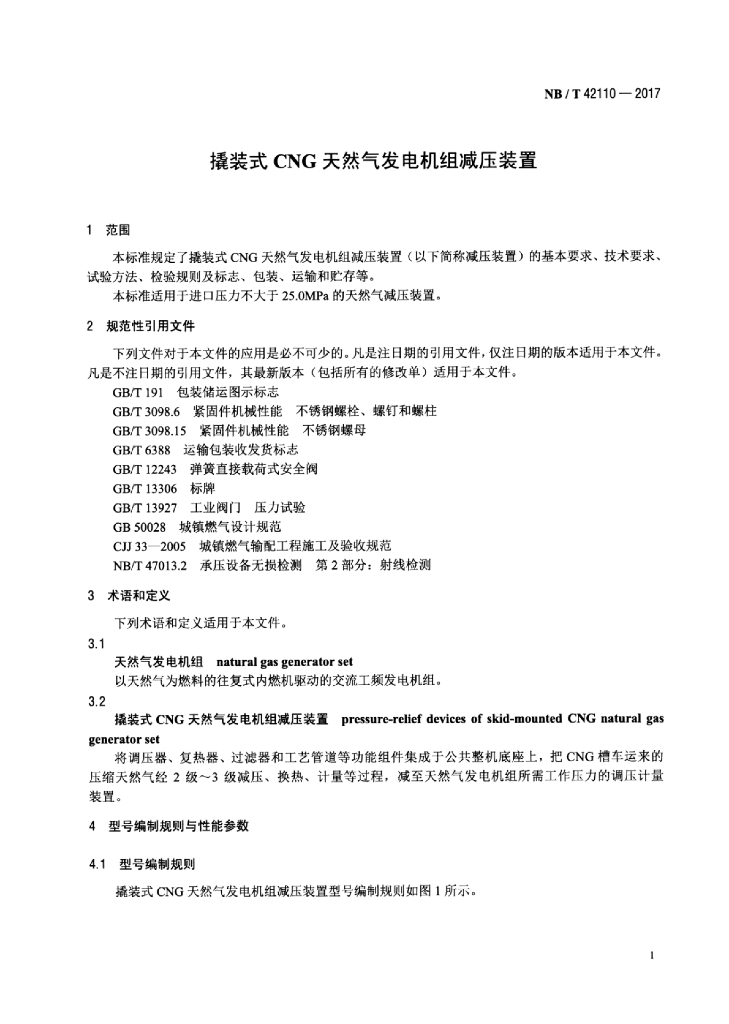 NB/T 42110-2017 撬装式CNG天然气发电机组减压装置