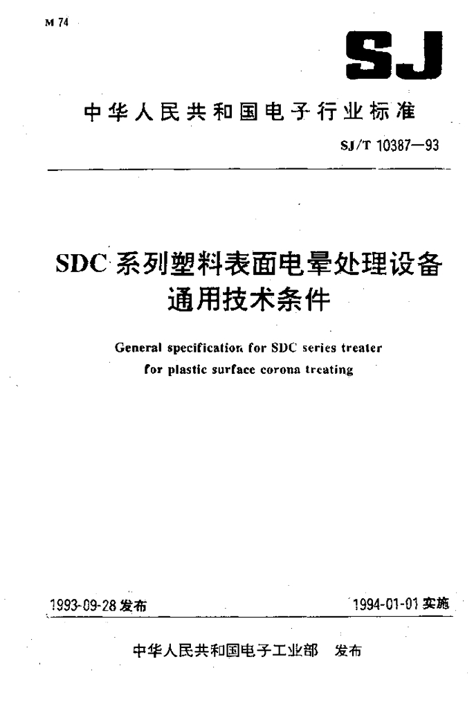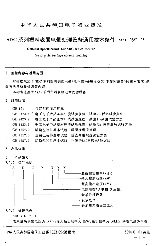 SJ/T 10387-1993 SDC系列塑料表面电晕处理设备通用技术条件