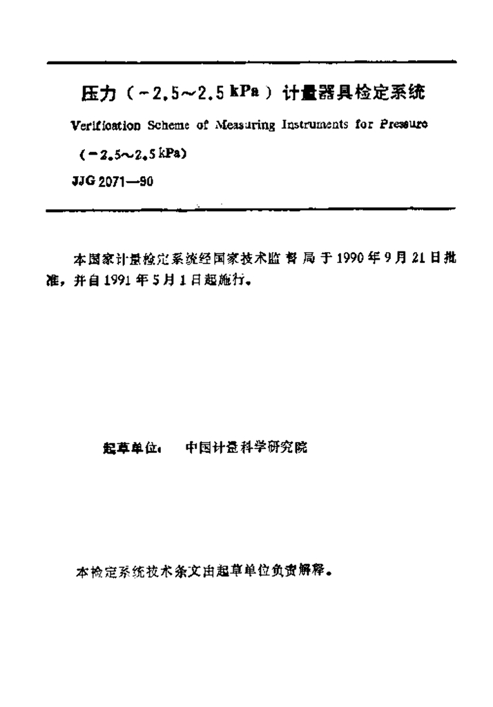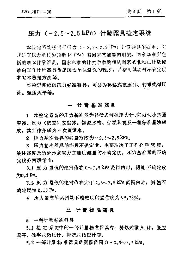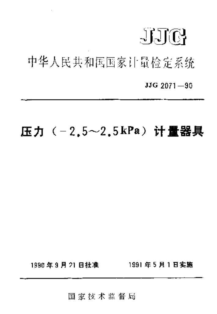 JJG 2071-1990 压力(-2.5~2.5kPa)计量器具检定系统