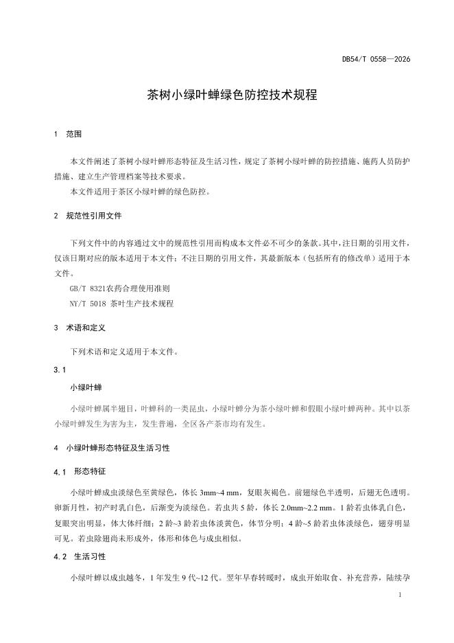 DB54/T 0558-2026 茶树小绿叶蝉绿色防控技术规程