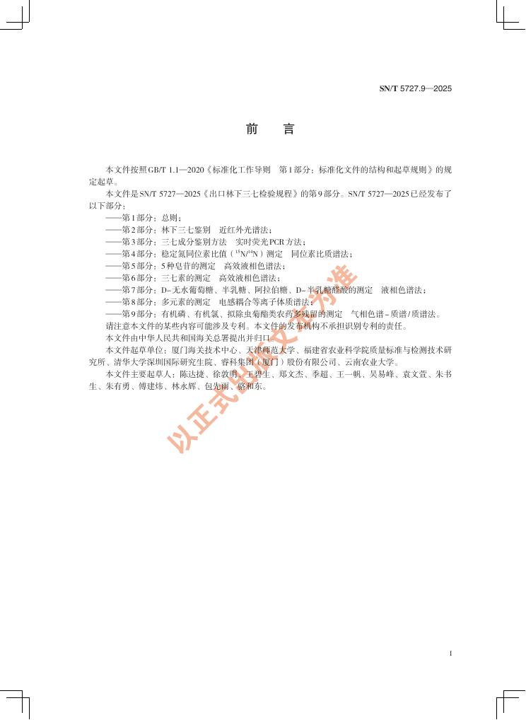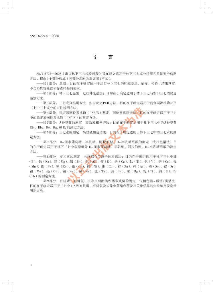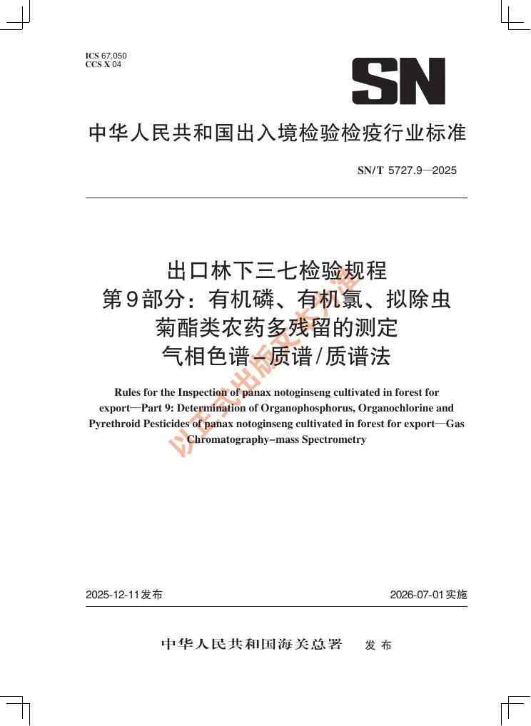 SN/T 5727.9-2025 出口林下三七检验规程 第9部分:有机磷、有机氯、拟除虫菊酯类农药多残留的测定 气相色谱-质谱/质谱法