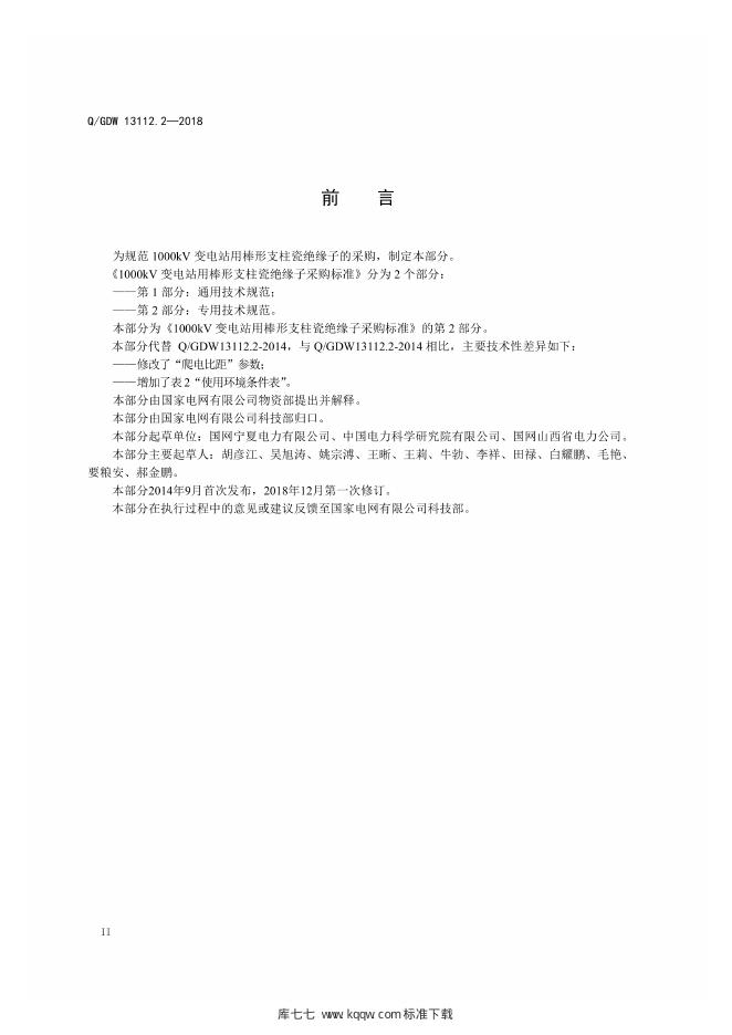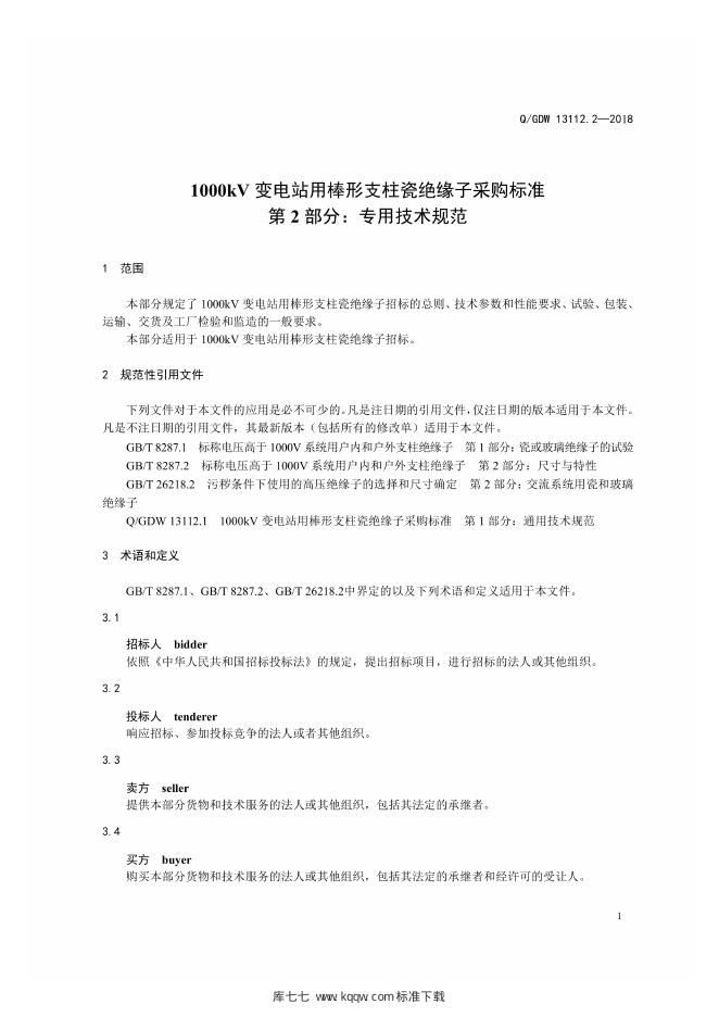 Q/GDW 13112.2-2018 1000kV变电站用棒形支柱瓷绝缘子采购标准 第2部分:专用技术规范