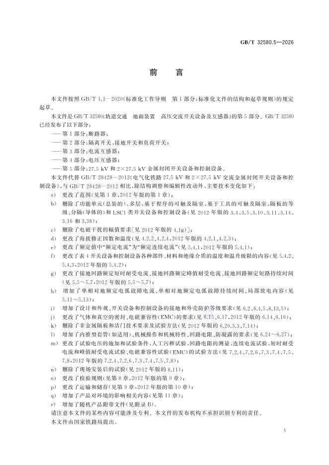 GB/T 32580.5-2026 轨道交通 地面装置 高压交流开关设备及互感器 第5部分:27.5kV和2×27.5kV金属封闭开关设备和控制设备
