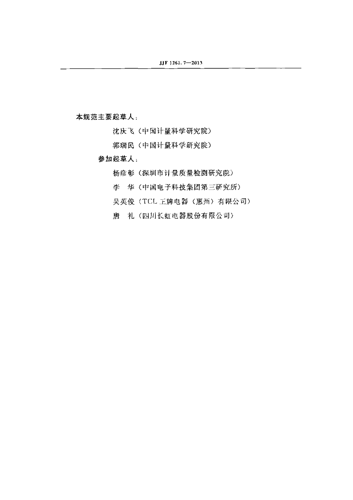 沈庆飞(中国计量科学研究院)、郭瑞民(中国计量科学研究院)、杨彦彰(深圳市计量质量检测研究院)、李华(中国电子科技集团第三研究所)、吴英俊(TCL王牌电器(惠州)有限公司)、唐礼(四川长虹电器股份有限公司)