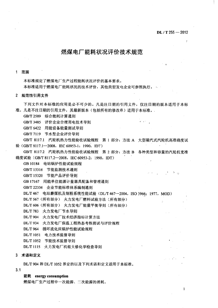 DL/T 255-2012 燃煤电厂能耗状况评价技术规范