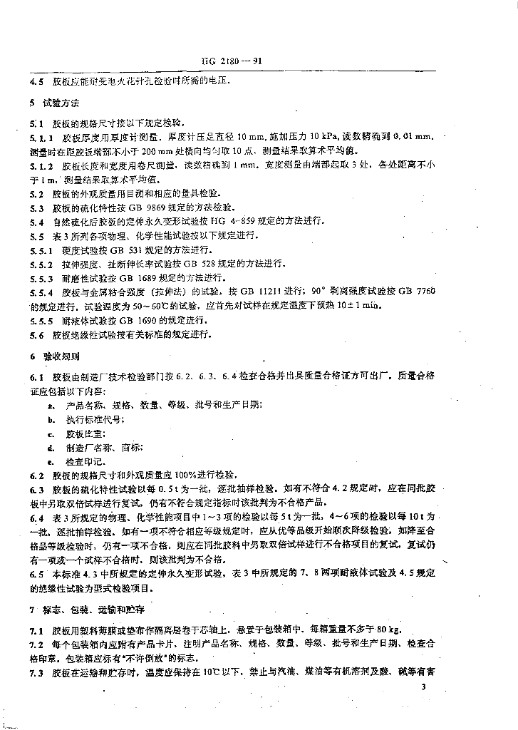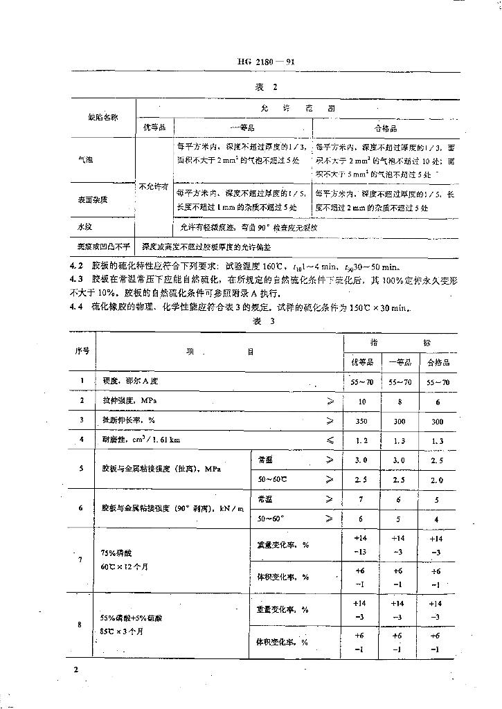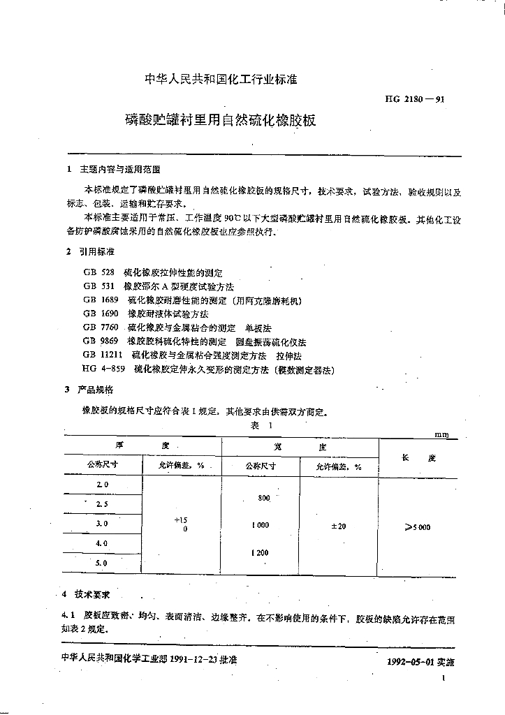 HG 2180-1991 磷酸贮罐衬里用自然硫化橡胶板