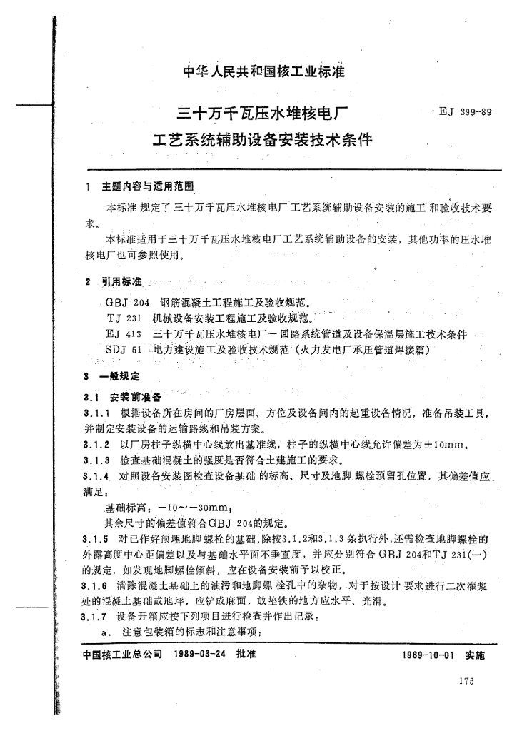 EJ/T 399-1989 三十万千瓦压水堆核电厂 工艺系统辅助设备安装技术条件