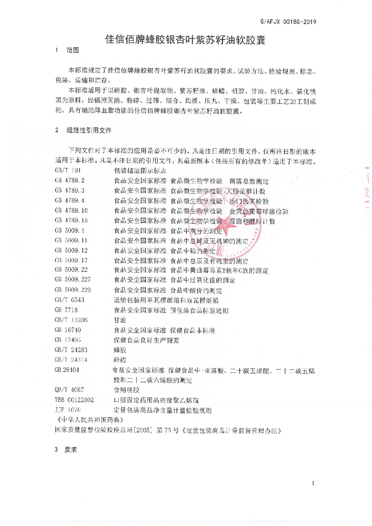Q/AFJX 0018S-2019 佳信佰牌蜂胶银杏叶紫苏籽油软胶囊