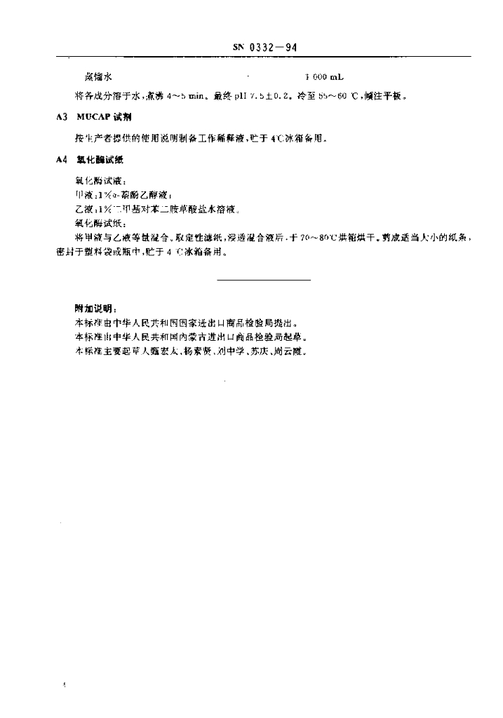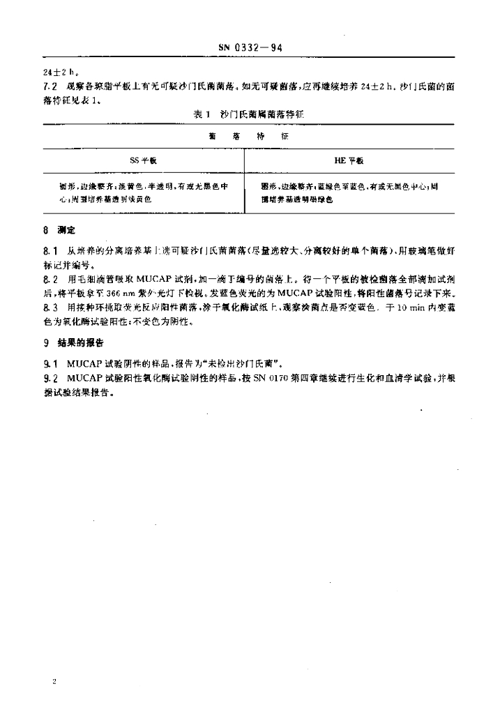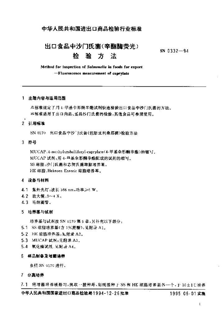 SN 0332-1994 出口食品中沙门氏菌(辛酯酶荧光)检验方法