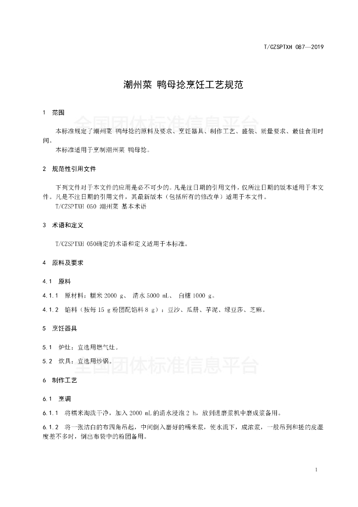 T/CZSPTXH 087-2019 潮州菜 鸭母捻烹饪工艺规范