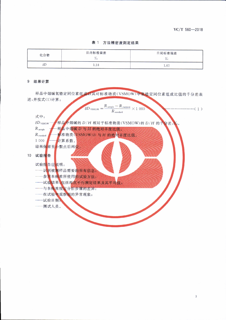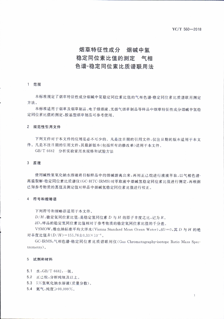 YC/T 560-2018 烟草特征性成分 烟碱中氢稳定同位素比值的测定 气相色谱-稳定同位素比质谱联用法
