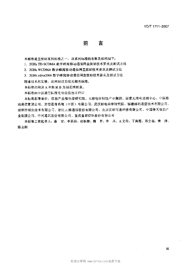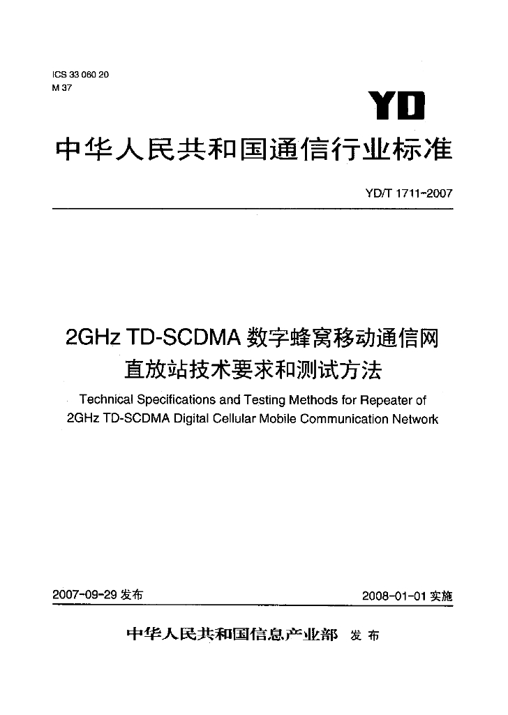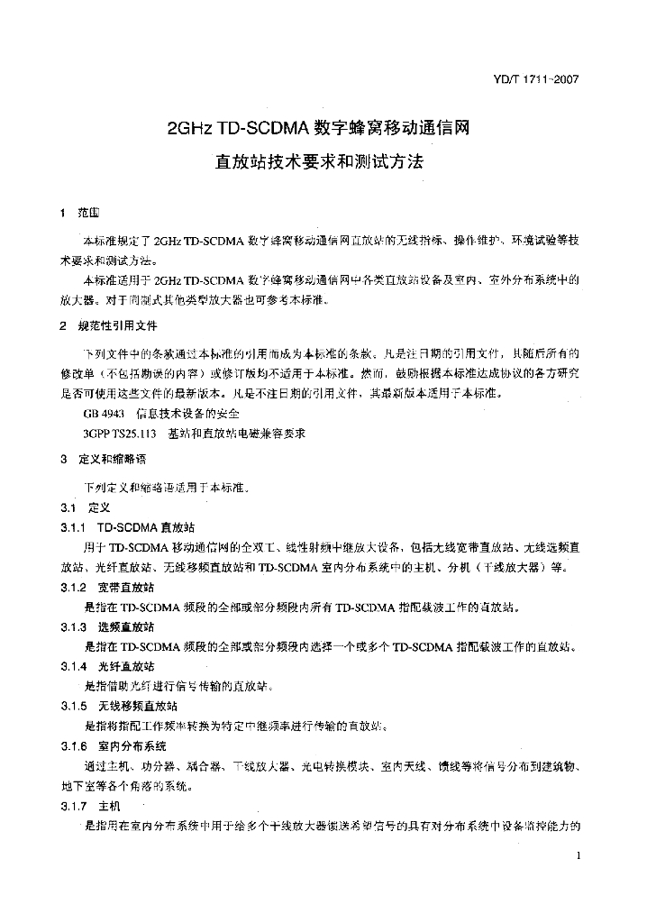 YD/T 1711-2007 2GHz TD-SCDMA 数字蜂窝移动通信网直放站技术要求和测试方法