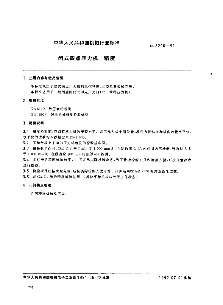 JB 5200-1991 闭式四点压力机精度