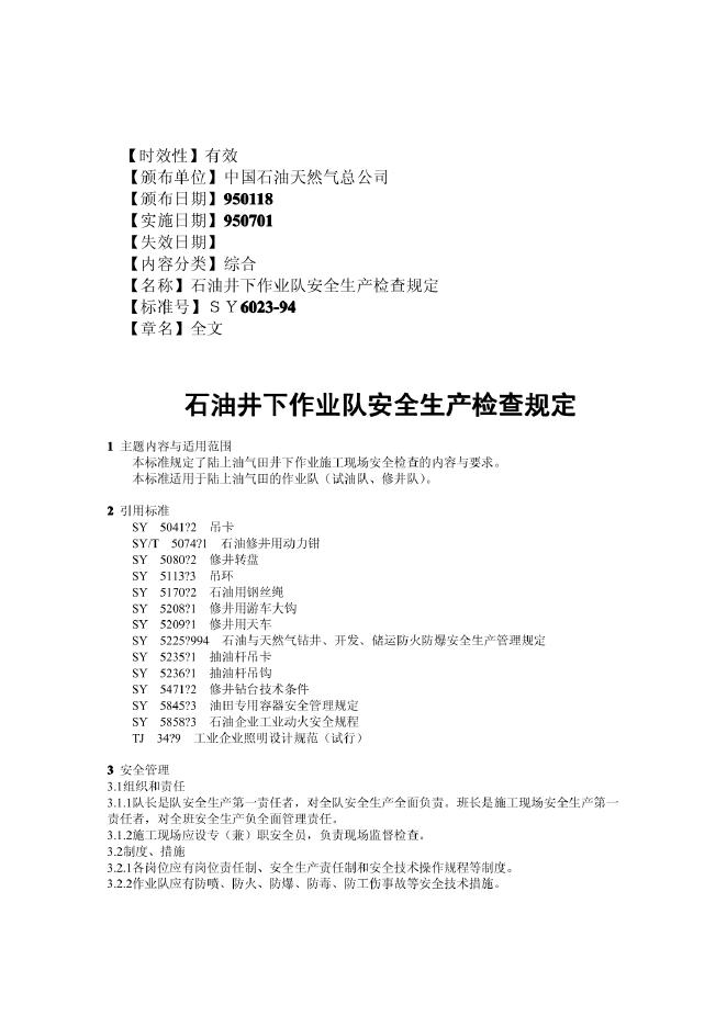 SY 6023-1994 石油井下作业队安全生产检查规定