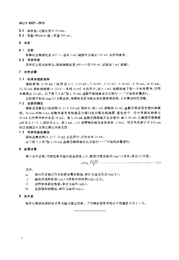 HG/T 4327-2012 再生水中总铁含量的测定分 光光度法