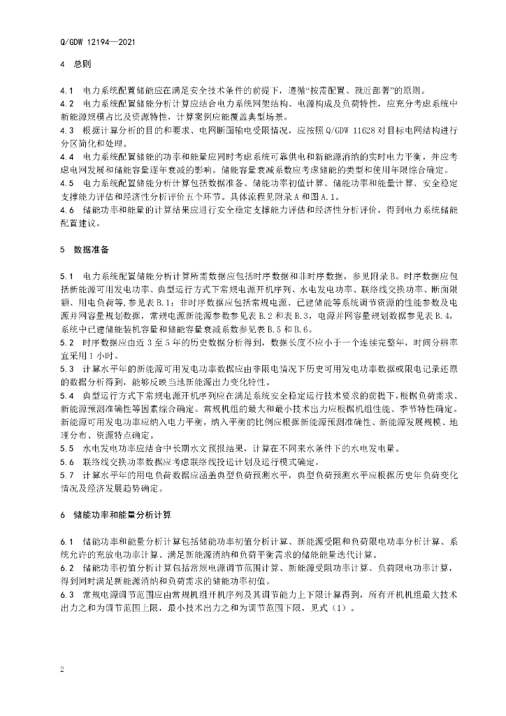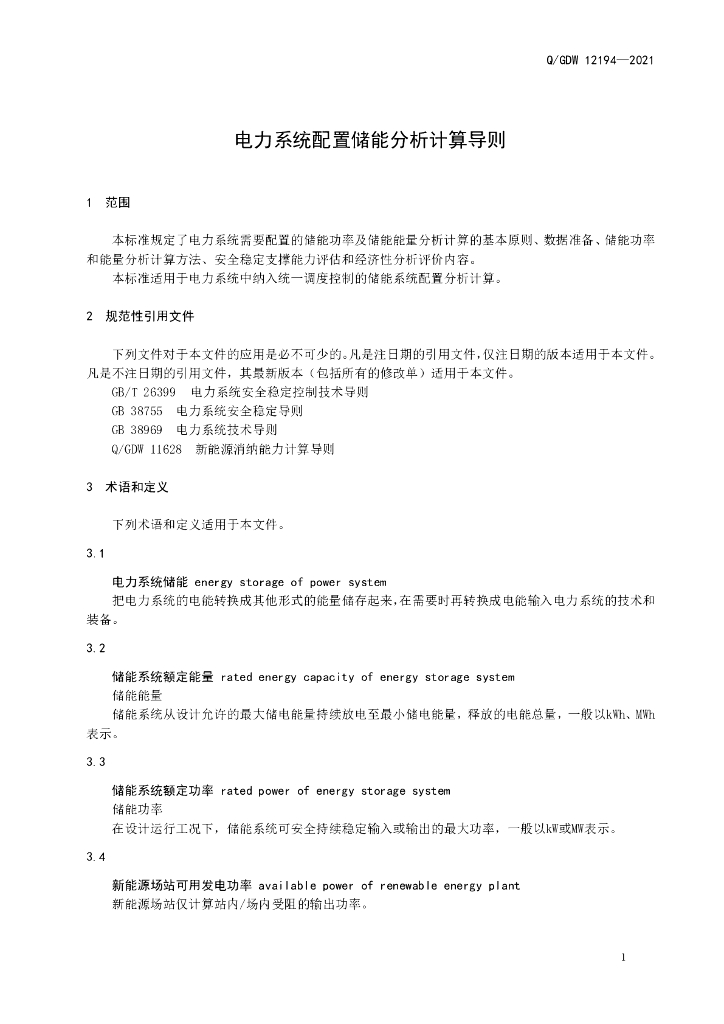 Q/GDW 12194-2021 电力系统配置储能分析计算导则