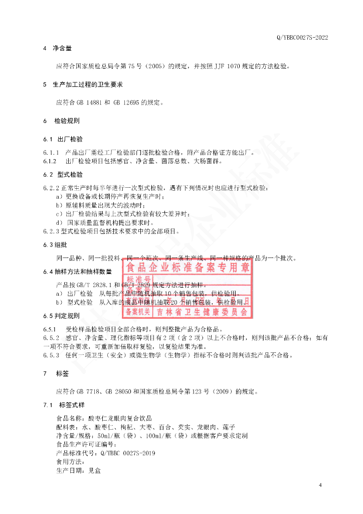 Q/YBBC 0027S-2022 酸枣仁龙眼肉复合饮品