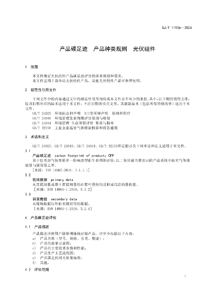 SJ/T 11926-2024 产品碳足迹 产品种类规则 光伏组件