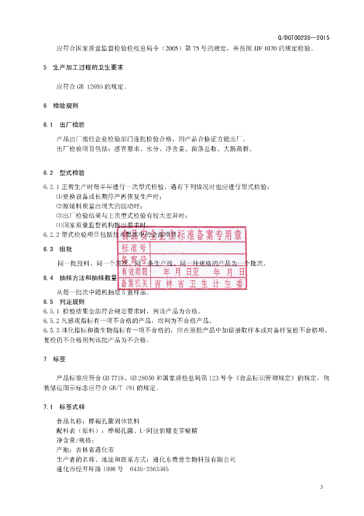 Q/DGT 0023S-2015 通化东贵堂生物科技有限公司 桦褐孔菌固体饮料