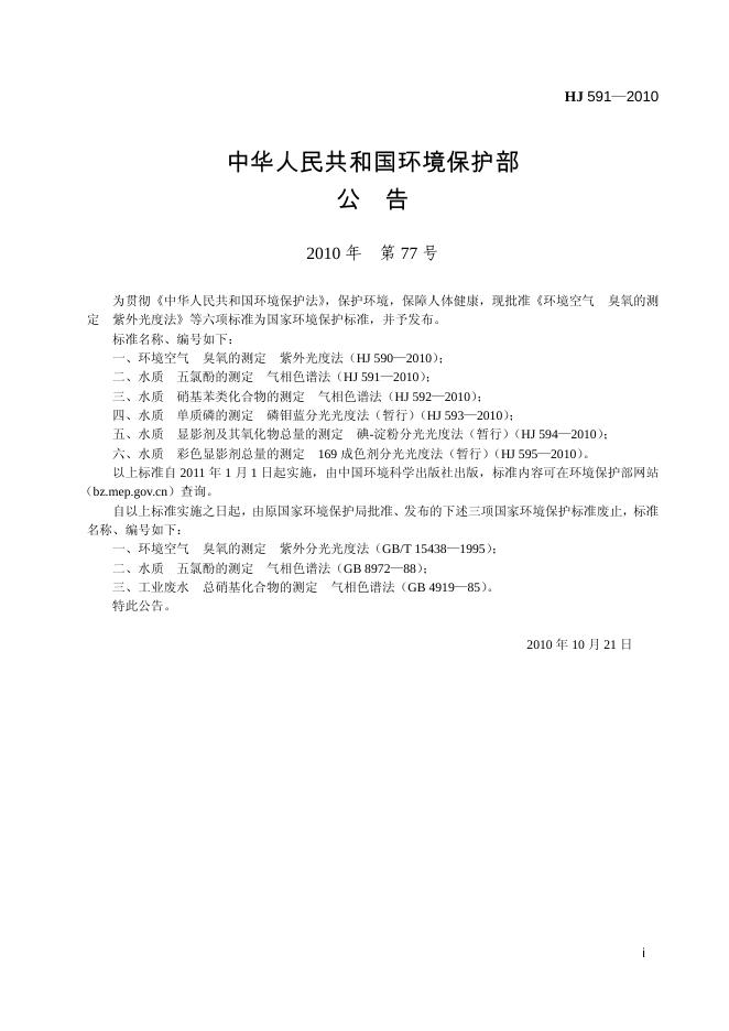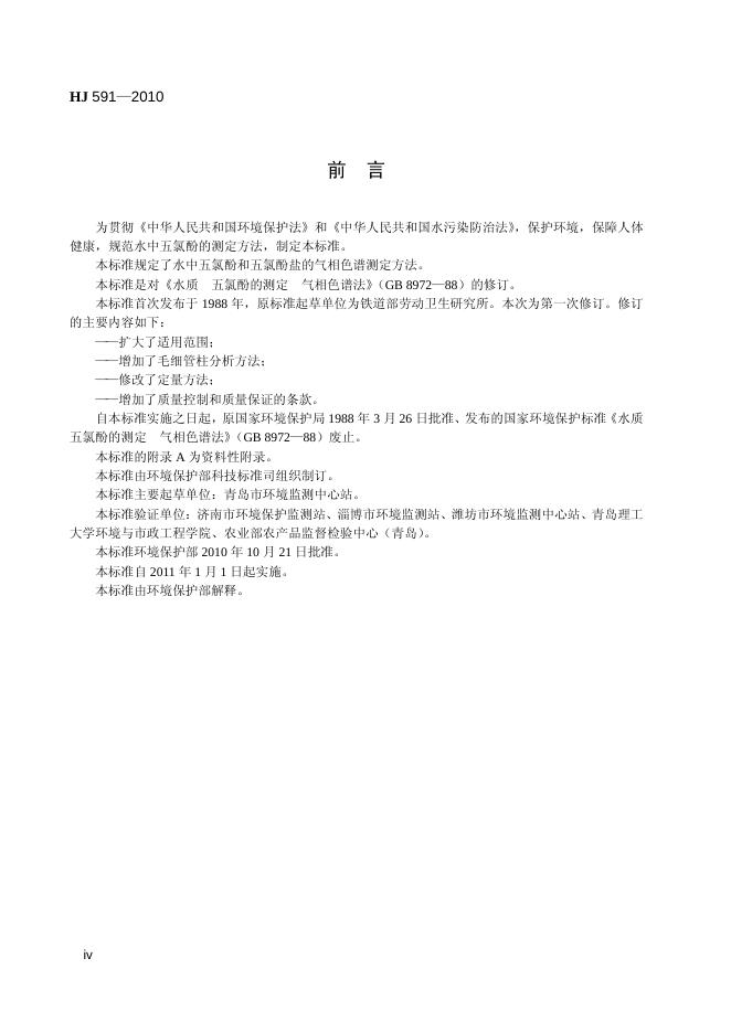 HJ 591-2010 水质 五氯酚的测定 气相色谱法