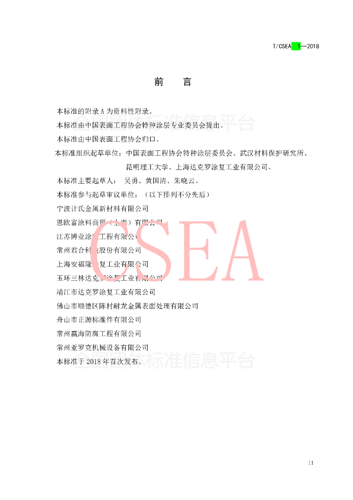 中国表面工程协会特种涂层委员会、武汉材料保护研究所、昆明理工大学、上海达克罗涂复工业有限公司、宁波计氏金属新材料有限公司、恩欧富涂料商贸(上海)有限公司、江苏博业涂装工程有限公司、常州君合科技股份有限公司、上海安福隆涂复工业有限公司、玉环三林达克罗涂复工业有限公司、靖江市达克罗涂复工业有限公司、佛山市顺德区陈村耐龙金属表面处理有限公司、舟山市正源标准件有限公司、常州嬴海防腐工程有限公司、常州亚罗克机械设备有限公司