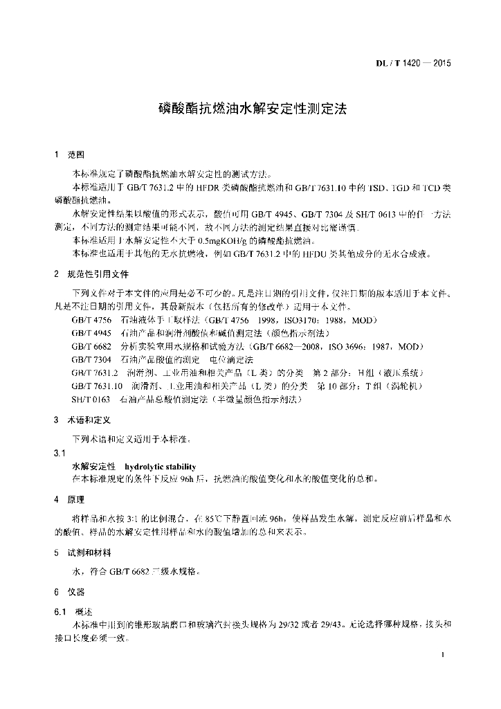 DL/T 1420-2015 磷酸酯抗燃油水解安定性测定法