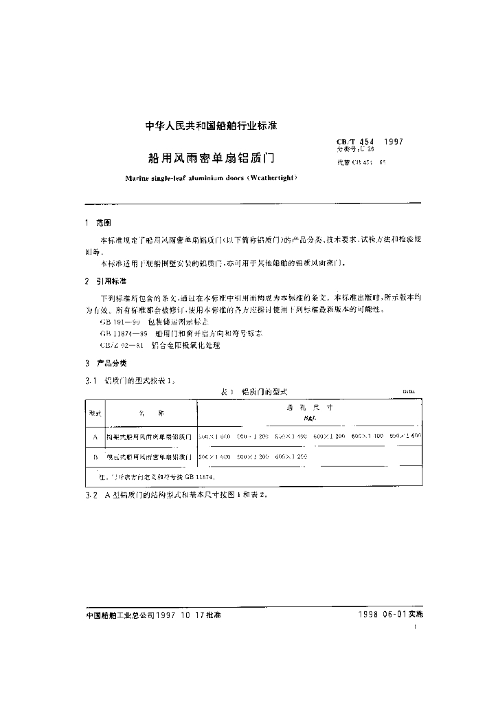 CB/T 454-1997 船用风雨密单扇铝质门