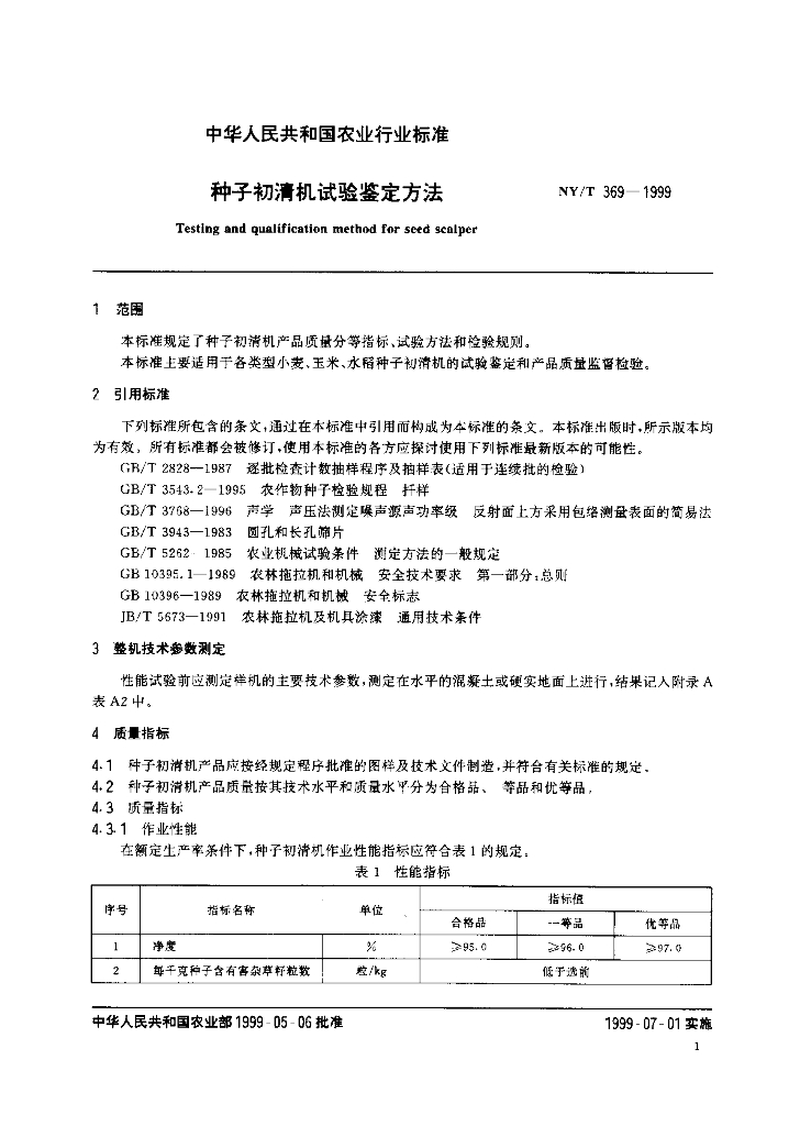 NY/T 369-1999 种子初清机试验鉴定方法