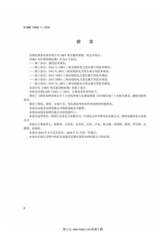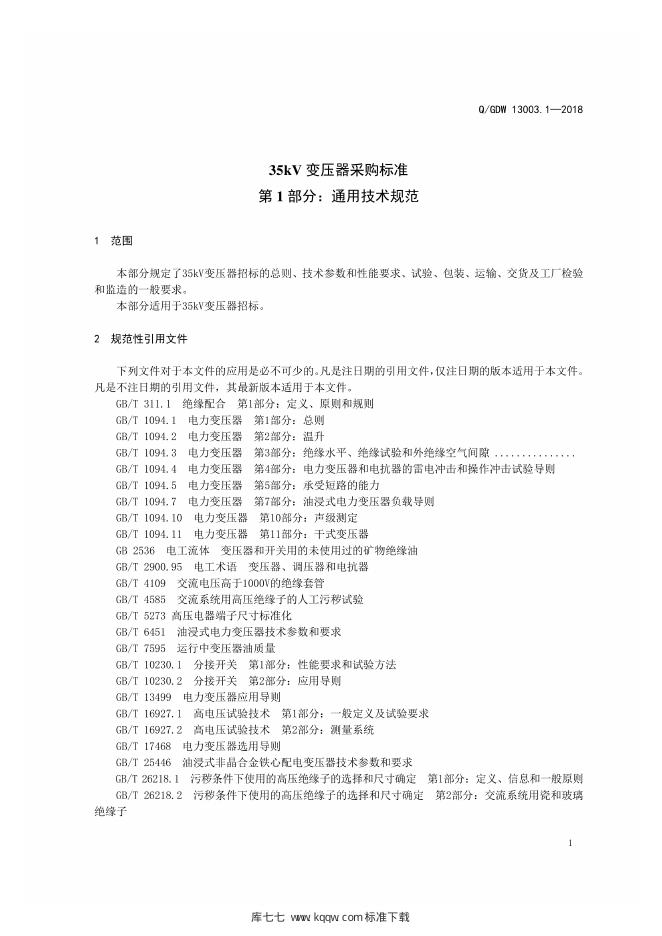 Q/GDW 13003.1-2018 35kV变压器采购标准 第1部分:通用技术规范